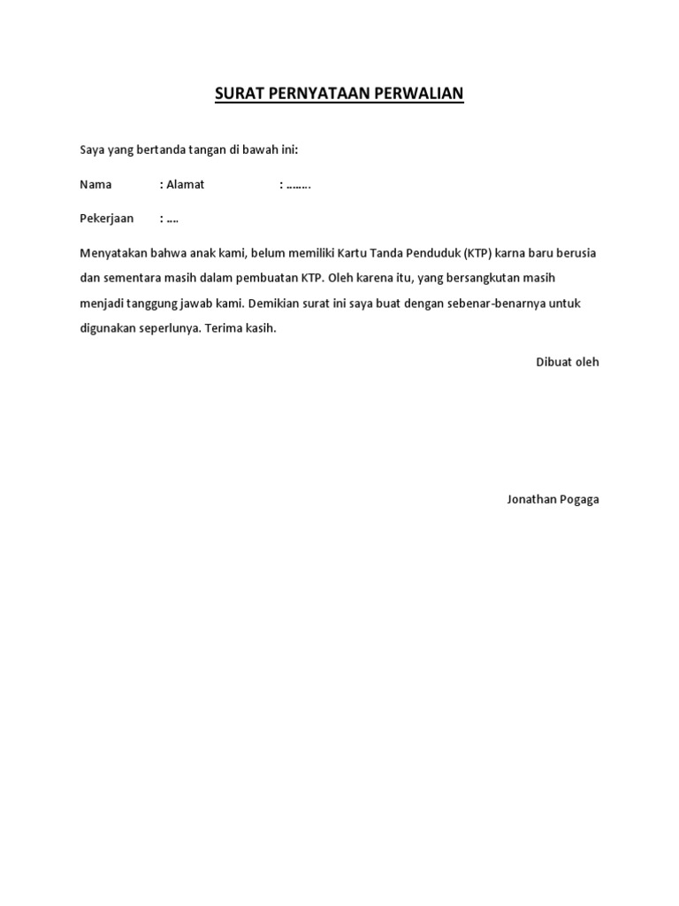 Pembubuhan materai pada surat pernyataan berfungsi untuk menegaskan bahwa surat tersebut mempunyai kekuatan hukum dan dapat diperkarakan apabila terjadi pelanggaran isi pernyataan. Kali ini, saya akan memberikan contoh surat permohonan perwalian di pengadilan negeri bagi awam. Sedangkan perbedaannya adalah pada perwalian, pemeliharaan. Surat pernyataan perwalian pada perdata / dalam interaksi manusia dengan manusia lain acap kali terdapat perselisihan. Permohonan akan surat pernyataan dewasa boleh diajukan kepada pemerintah oleh anak yang di bawah umur, bila ia telah mencapai umur dua puluh tahun penuh.